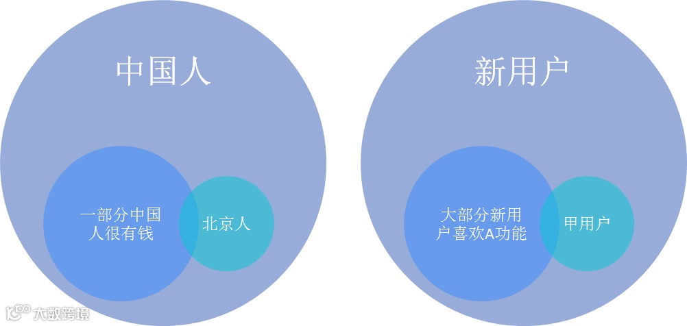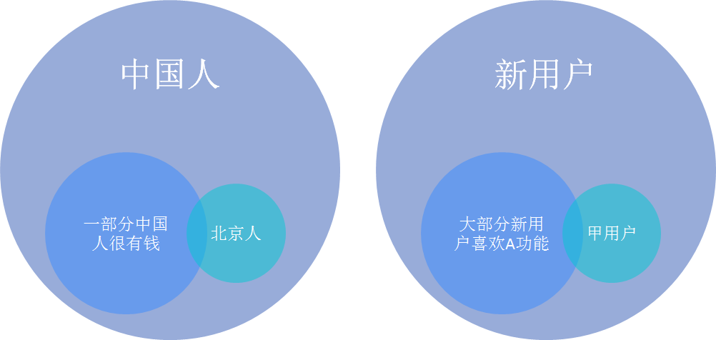 因大前提“新用户喜欢使用A功能”实际上是“大部分新用户会使用A功能”,这是可以通过数据得出的结论,比如60%的新用户都会用这个功能。等同于“一部分中国人很有钱”