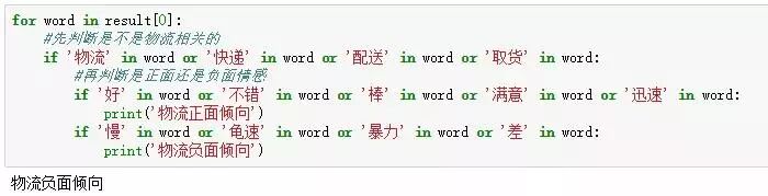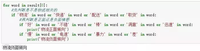 在我们预设词的基础上进行两次遍历匹配,大体可以判断这句话是不是和物流相关,以及客户对物流的看法是正面还是负面: