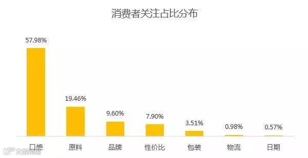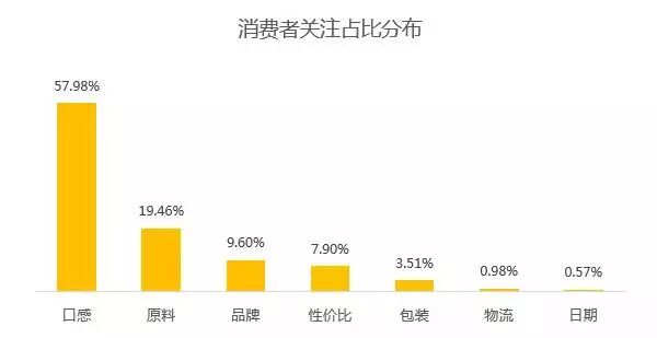 慢随其后的,是原料、品牌、性价比和包装,而物流和日期则鲜有提及,消费者貌似不太关注,或者说目前基本满足要求。