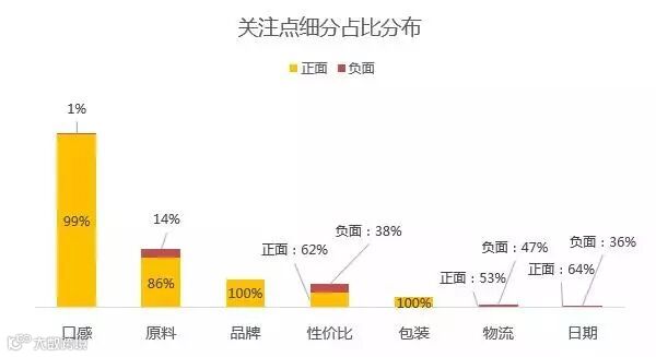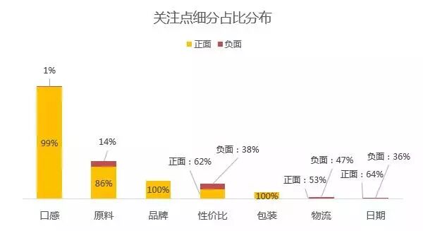 整体来看,主流评论以好评为主,其中口感、品牌(这个地方其实没有细分)、包装以正面评价占绝对主导。
