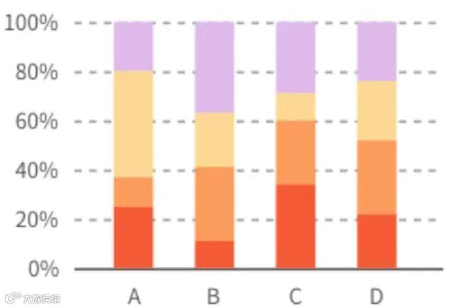 百分比堆积柱形图:对比同一个分组数据内不同分类的占比,分组少