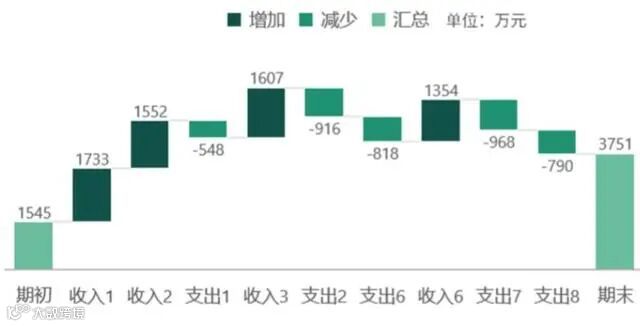 垂直瀑布图:一般适用于汇报数量的增减,比如一年中各月销售额、用户数等指标的变化