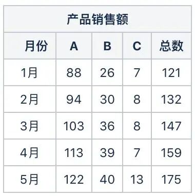 或者你可能想把重点集中在某一点上,比如说集中在 5 月份的数据上,你可能会记录产品 A,B 和 C 的销售量排列名次。那样的话,图表主题应该是「5 月份,产品A的销售额大幅超过B和C」