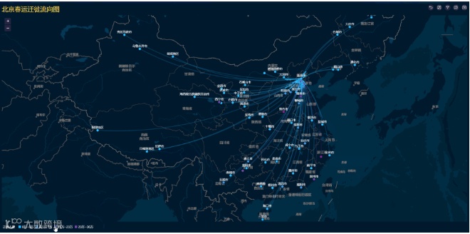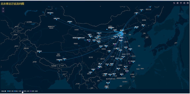流向地图:迁徙图是在两点之间绘制弧线进行连接,并配以动画呈现移动效果的图像,主要用于展示不同地点之间人员、物品、车辆等流动的方向。