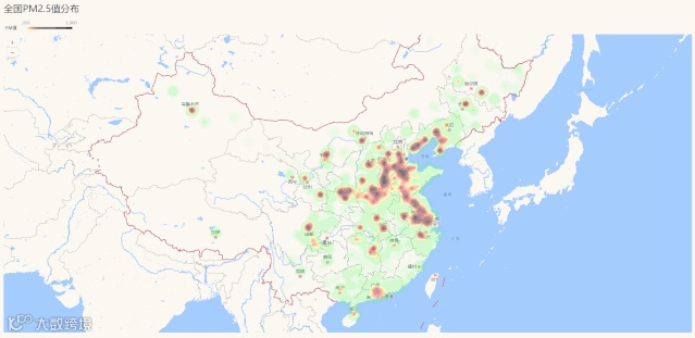 热力地图:热力图通过指定的半径范围进行数据叠加计算,然后与梯度颜色进行数据映射,不同的颜色深度代表不同的数据密度。通常适用于数据量比较多且在一定地域范围内相对密集的业务场景。
