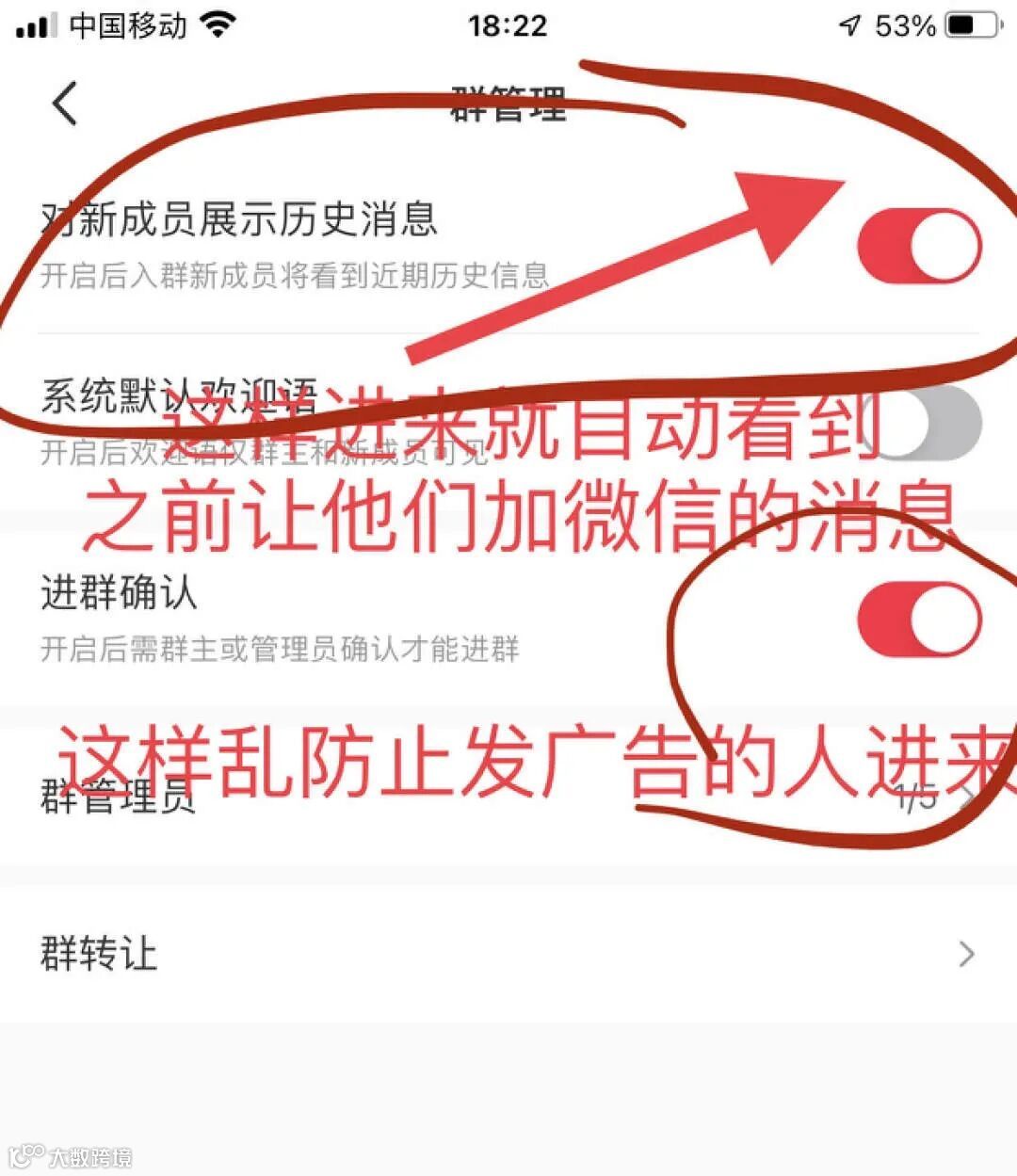 如果不想每次有人进来后,你一遍遍的发加微信的信息,你可以在群管理的设置里,开启“对新进群的人展示历史消息”。这样新人进群后,可以看到你之前发的,这样就能达到自动引流的效果。