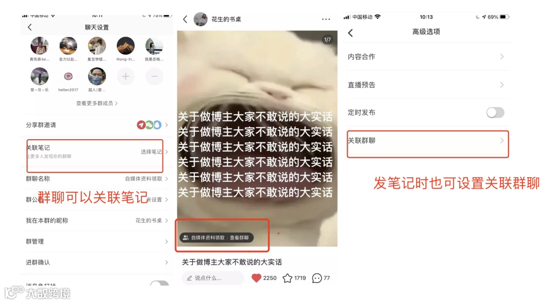 群聊的按钮会出现在主页的首页,发相关笔记的时候也可以把群聊口令贴在评论区置顶。