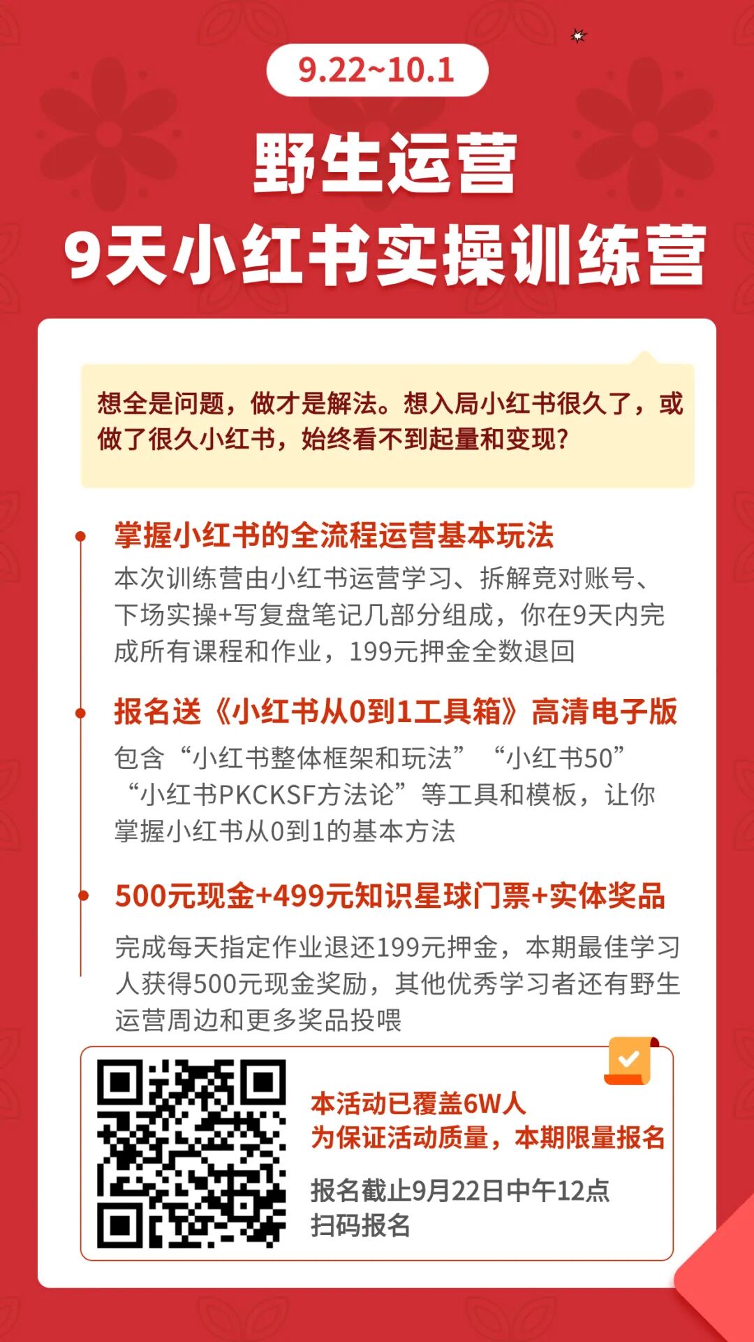 帮助想做小红书(个人做号和企业做号)的人,和目前在做小红书但没得要领(包括增长缓慢,不能变现)的人通过学习营的案例拆解和下场实操,掌握做小红书从0到1的运营基本方法。