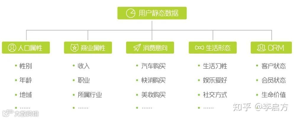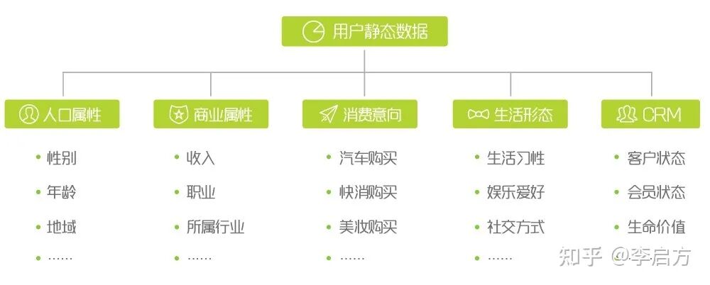 常见的用户数据可分为静态数据和动态数据。由静态数据标签搭建出就是2D用户画像,例如小明,男,25岁,北京;而动态数据标签+静态数据标签,搭建出来的就是3D用户画像,例如小明于3.11登入30min,访问了某页面4次后,将商品加入购物车,这些就是属于动态的信息,是随着时间不断变化。
