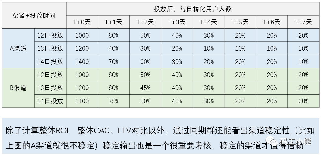 如果在用户同期群分析的时候,把分类维度,改成:从XX渠道进来的用户。则可以进一步做出:渠道质量同期群分析。常见的形式如下: