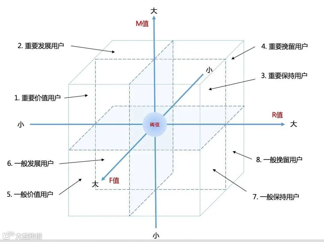 下面这个RFM模型就是利用象限法,将用户分为8个不同的层级,从而对不同用户制定不同的营销策略。