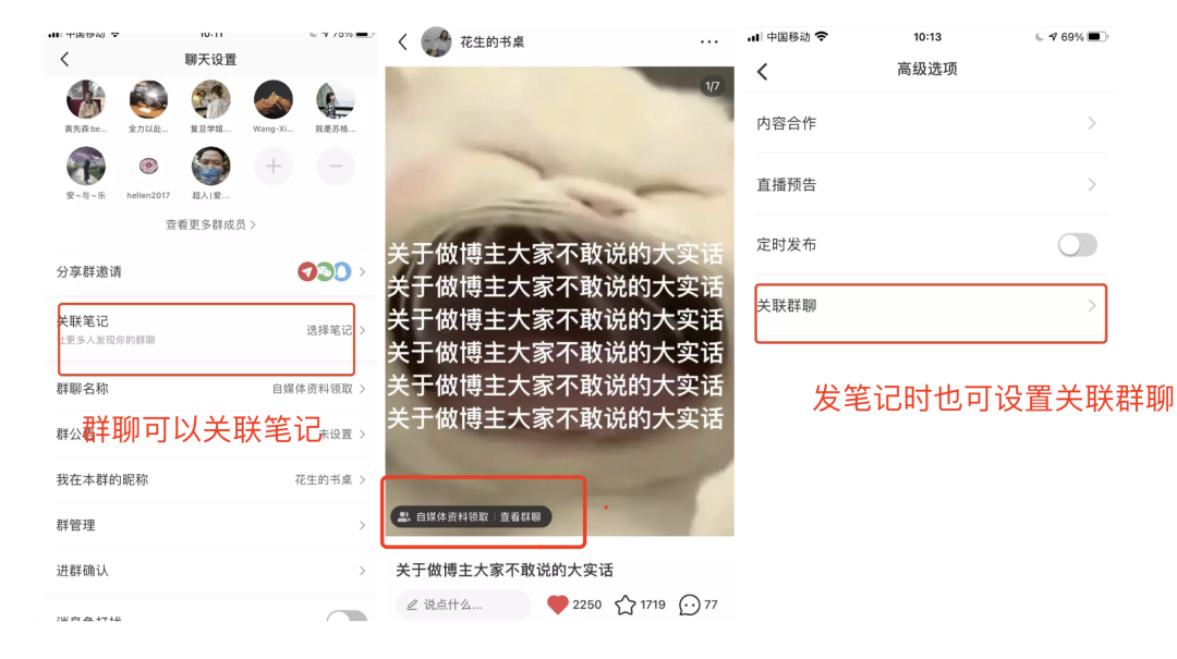 群聊的按钮会出现在主页的首页,发相关笔记的时候也可以把群聊口令贴在评论区置顶。