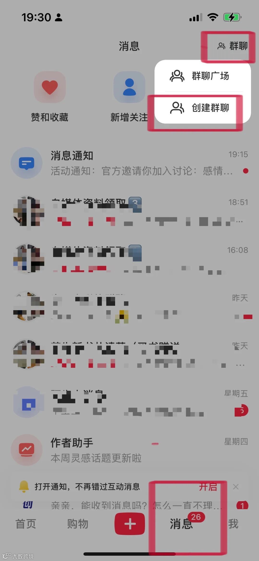 用小红书APP里的群聊功能创建群聊,在群内用小号留微信号。