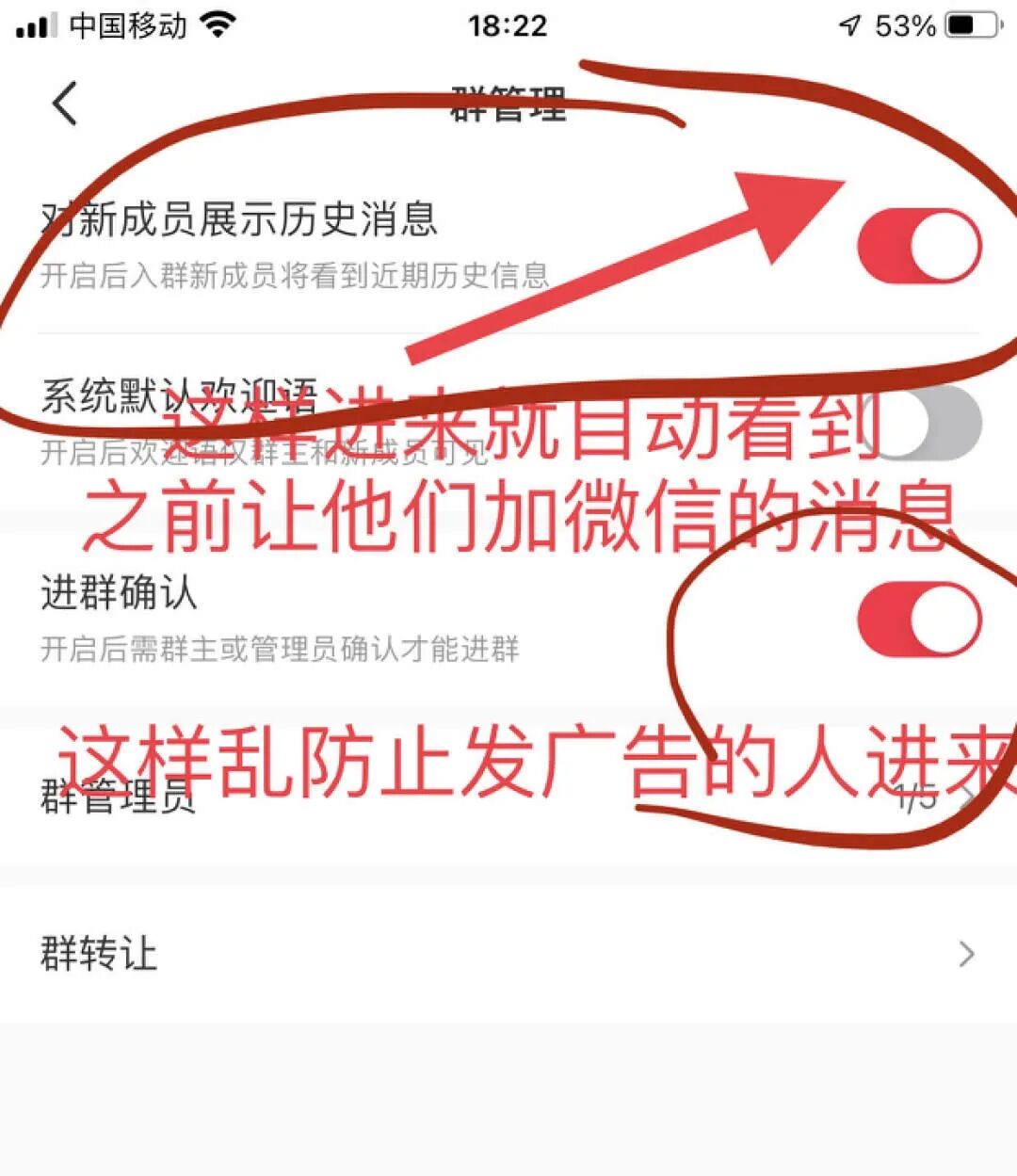 如果不想每次有人进来后,你一遍遍的发加微信的信息,你可以在群管理的设置里,开启“对新进群的人展示历史消息”。这样新人进群后,可以看到你之前发的,这样就能达到自动引流的效果。