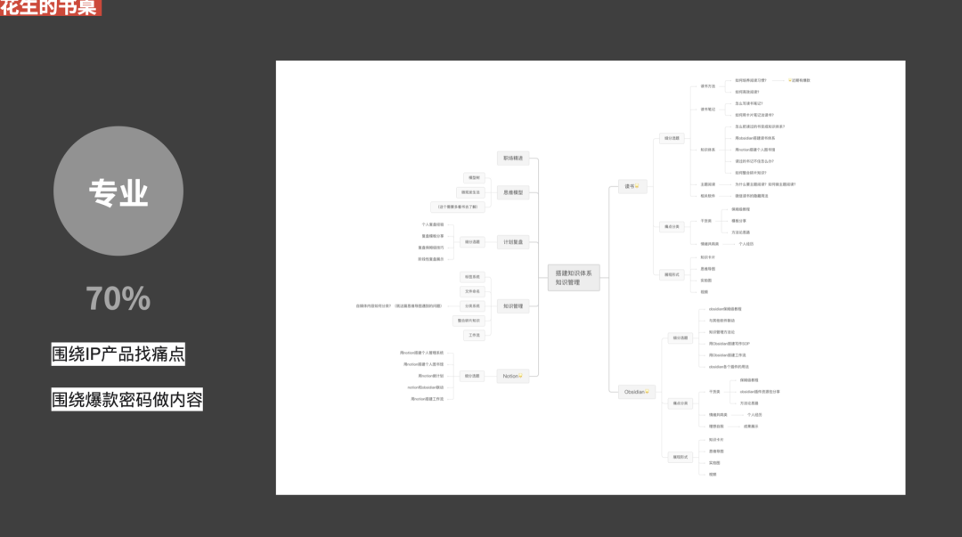 于是,这个做知识体系搭建课程的私教学员,根据痛点选题+一些爆款技法包装,做了一系列知识体系、SOP的选题,埋了钩子引流了精准付费用户买了他的知识体系课,几千粉就能单月变现3万。