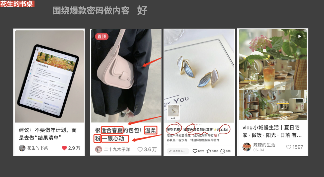 在小红书上的高颜值、美好的内容,可以分为美好的生活方式生活理念、好物、美好的人、颜值高的人、物品、景色,都是流量密码。