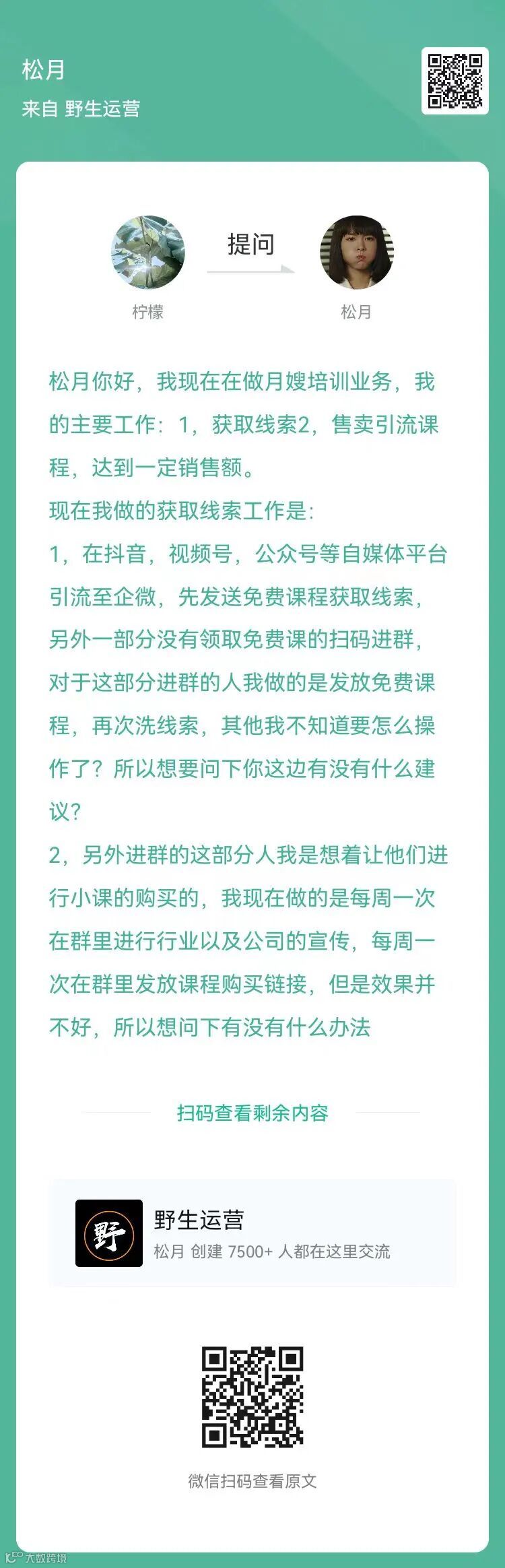 4、提问:我现在在做月嫂培训业务,在转化上遇到一些瓶颈?(扫码查看全文)