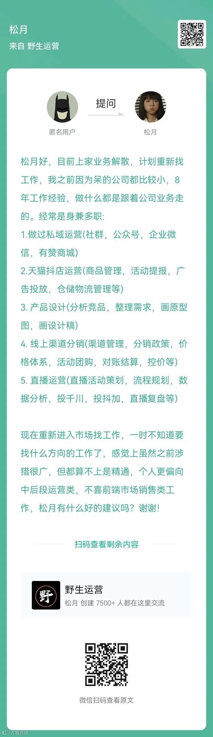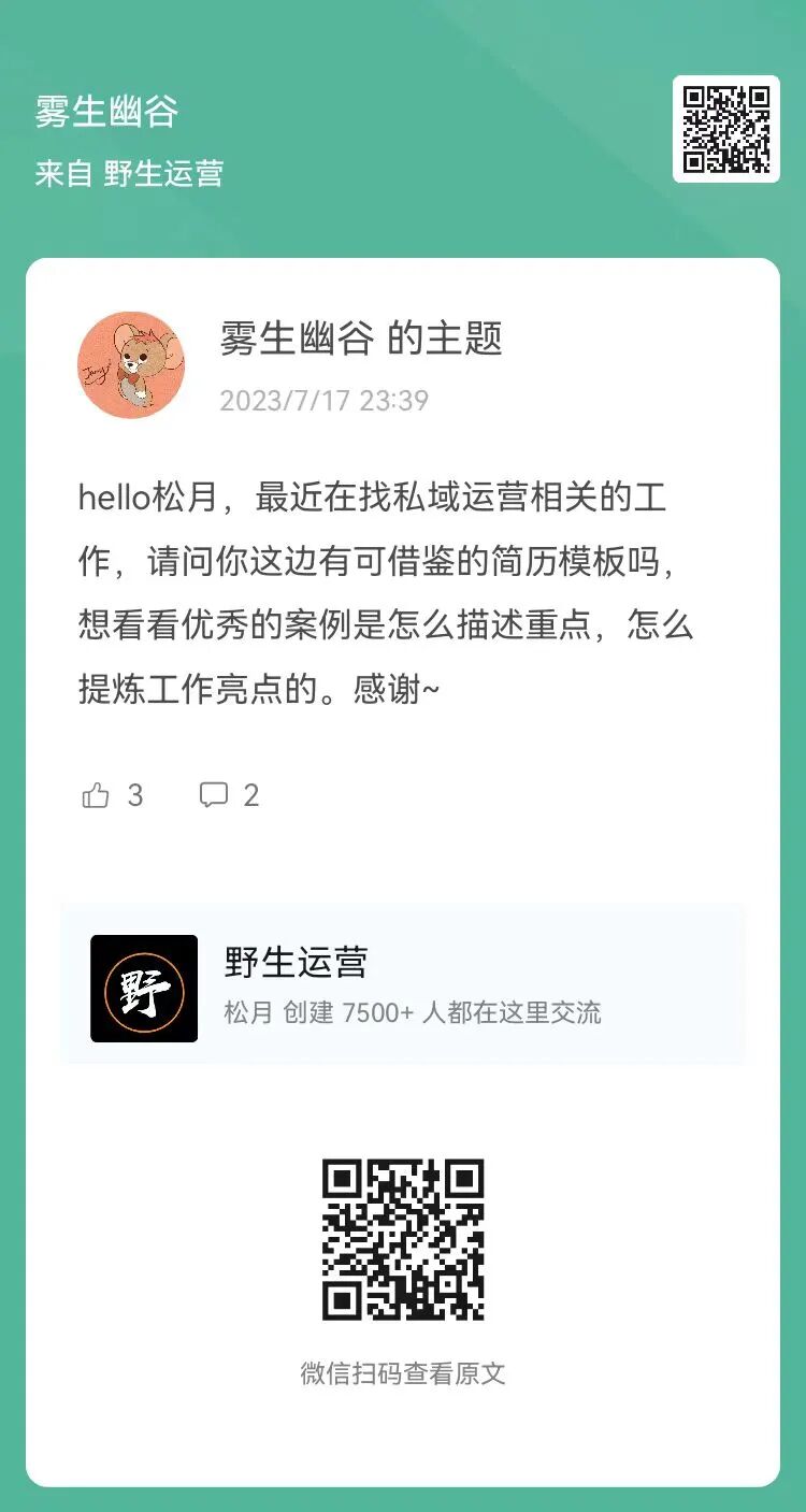 2、提问:最近在找私域运营相关的工作,请问你这边有可借鉴的简历模板吗?(扫码查看全文)