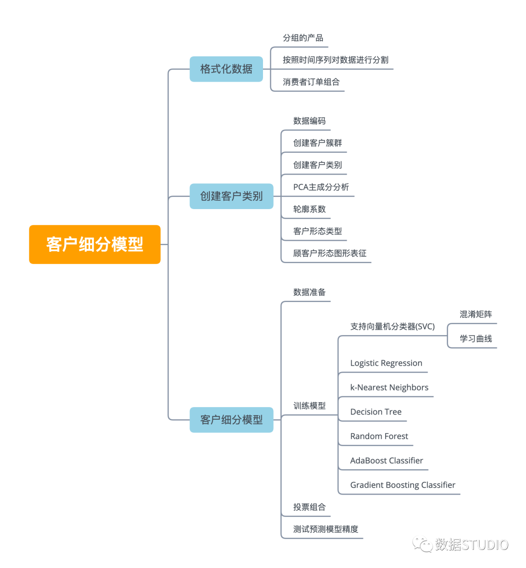 下篇(本篇)将继续对客户订单数据进行处理,将包括客户细分和客户行为分析与预测。本篇主要结构与内容思维导图如下图所示。