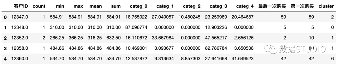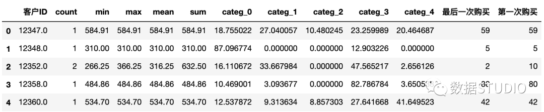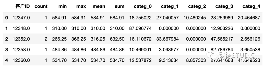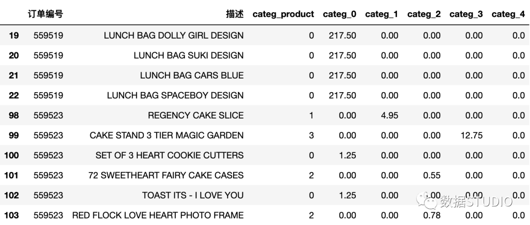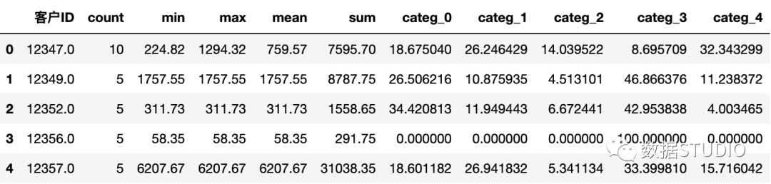 接下来创建categ_N变量( ),它包含在每个产品类别中花费的金额。这一步相当于一维数据转二维数据,将五个簇群扩展为五个分类变量,每个变量下存储的是该条记录的价格数据。
