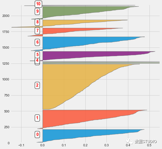 接下来,我们需要从之前定义的标准化矩阵中定义客户集群,这里使用了scikit-learn中的“k-means”聚类算法。根据轮廓系数选择最佳聚类的簇群数量,最后发现有11个聚类得到了最好的效果。