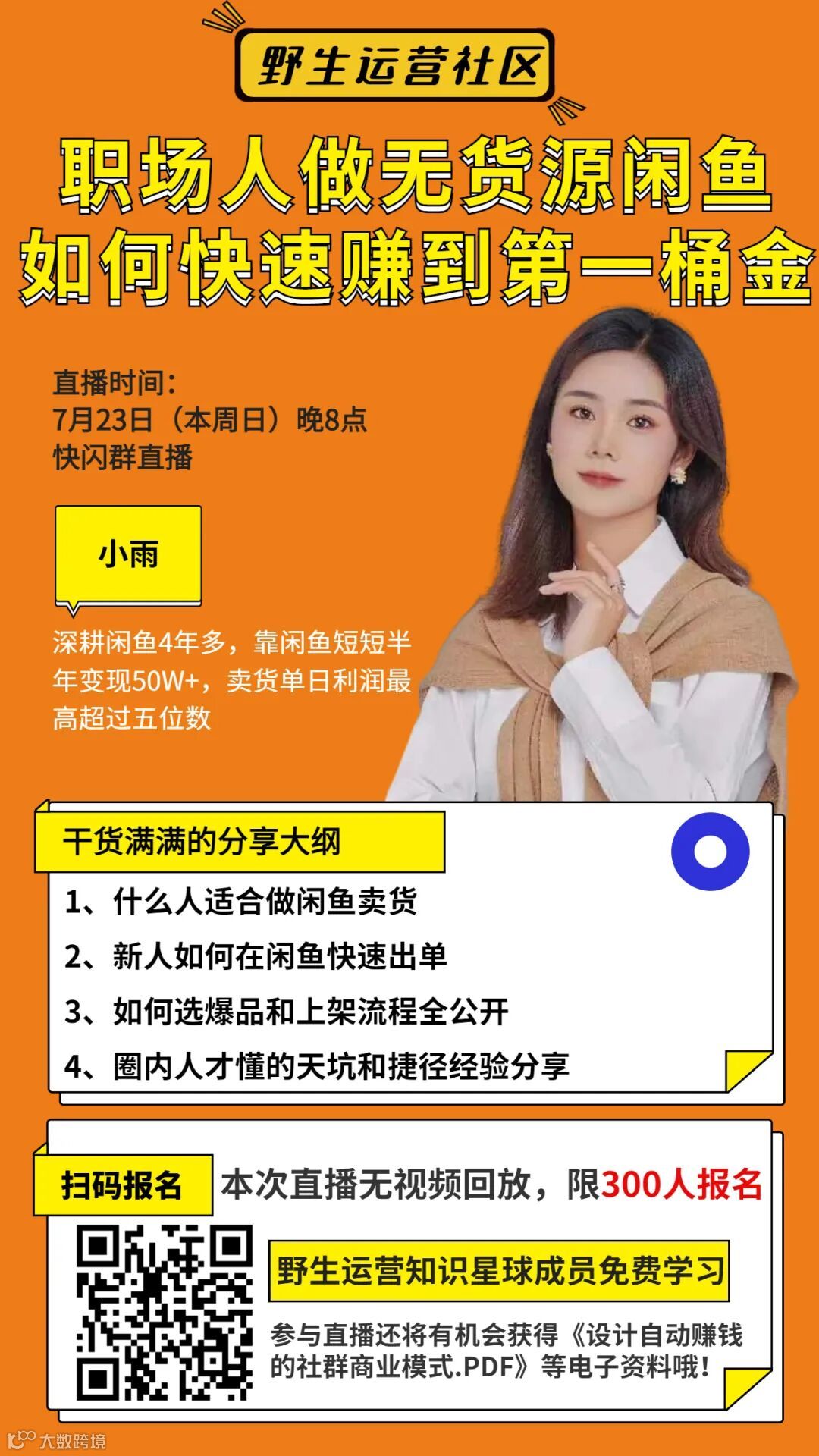 本周日晚8点,我邀请小雨,深耕闲鱼4年多,靠闲鱼短短半年变现50W+,卖货单日利润最高超过五位数,也是在星球上经常发布优质分享的小伙伴,带来分享《职场人做无货源闲鱼,如何快速赚到第一桶金》。本次分享不设视频回放,限量场观 300 人,想报名的小伙伴先上车😎参与直播,还有机会获得《设计自动赚钱的社群商业模式.PDF》等电子资料哦:)
