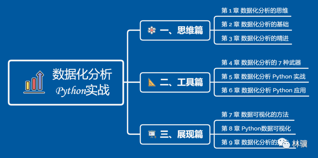 数据分析不是个事儿 今天推荐一本广受好评的数据分析实战电子书,其中包含思维篇、工具篇、展现篇等三大模块,分成 9 个章节,有 300+ 页,大约 10 万字,包含 100+ 图表,带你从数据分析思维入门,到 Python 编程实战,建立数据分析的完整知识体系。