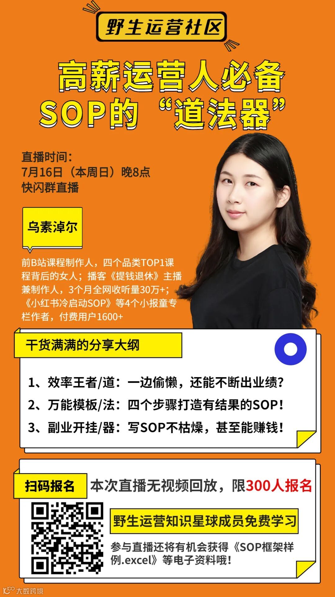 本周日晚8点,我邀请乌素淖尔,前B站课程制作人,四个品类TOP1课程背后的女人,带来分享《高薪运营人必备,SOP的“道法器”》。本次分享不设视频回放,限量场观 300 人,想报名的小伙伴先上车😎参与直播,还有机会获得《SOP框架样例.excel》等电子资料哦:)