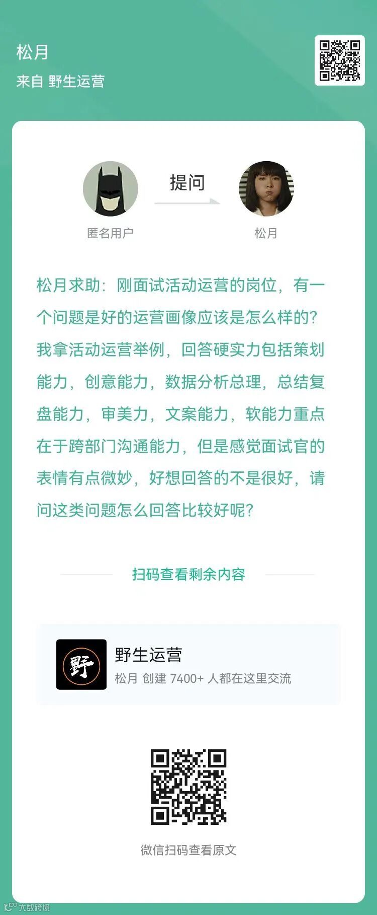 7、提问:刚面试活动运营的岗位,有一个问题是好的运营画像应该是怎么样的,应该怎么回答?(扫码查看全文)