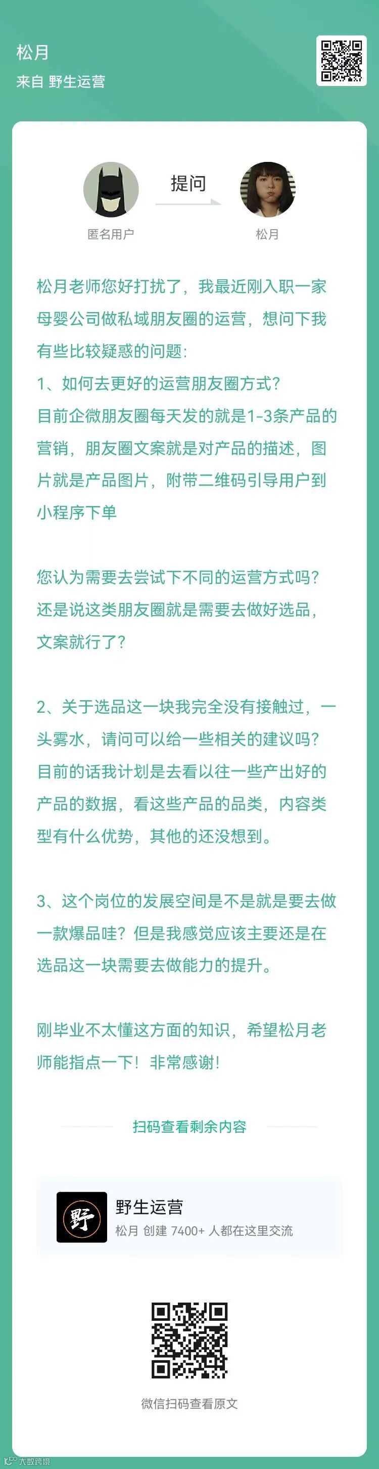 1、提问:刚刚入职私域朋友圈的运营岗位,请问如何去更好的运营朋友圈?(扫码查看全文)