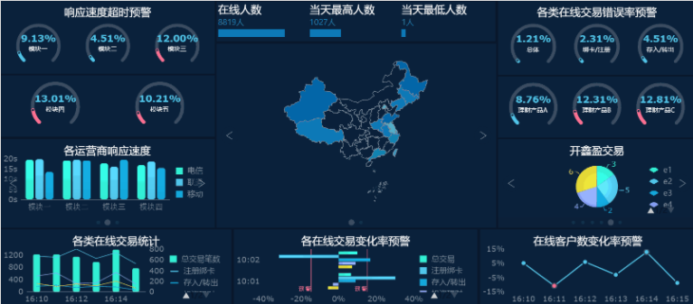 换句话说,可视化报表上的每句话、每个数据都是为主题服务的。比如下面这张驾驶舱模板,每一张图表和数字,都是围绕着金融交易平台的借贷还款情况的。