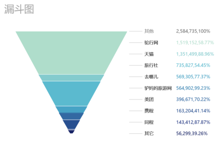 当我们想反映关键流程各个环节的转化情况时,就可以用各个环节的转化率数据制作出漏斗图,帮助用户发现问题所在和改进方向: