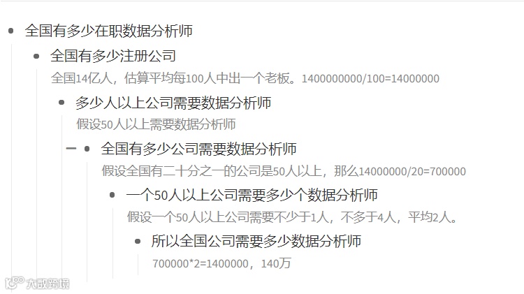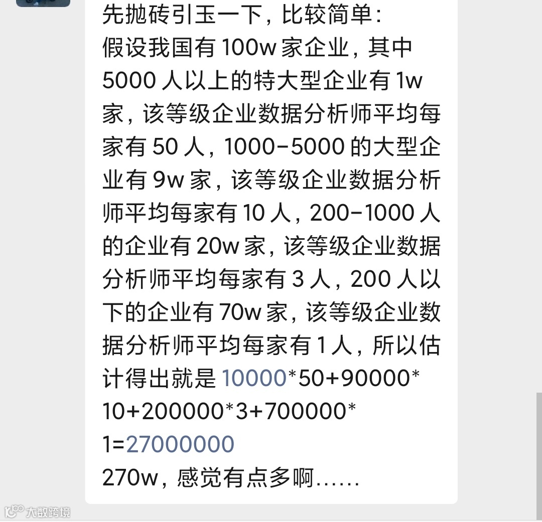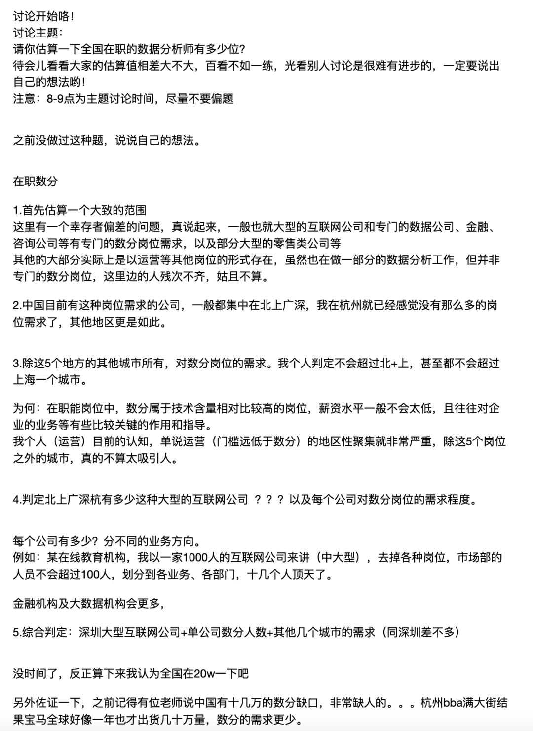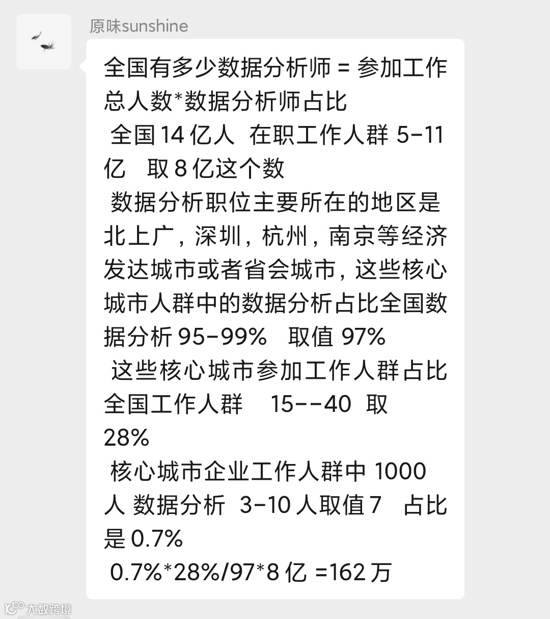 这是咱们群第一次讨论费米问题,可能很多朋友不知道该怎么去拆解、回答,但实际在重逻辑和数据的行业里,比如数据、咨询、产品、运营岗,费米估算都是笔面试的常见题型。这类题目在分解的时候,也是比较有趣的。所以无论如何,大家都要学会这类题目的解题方法哟。