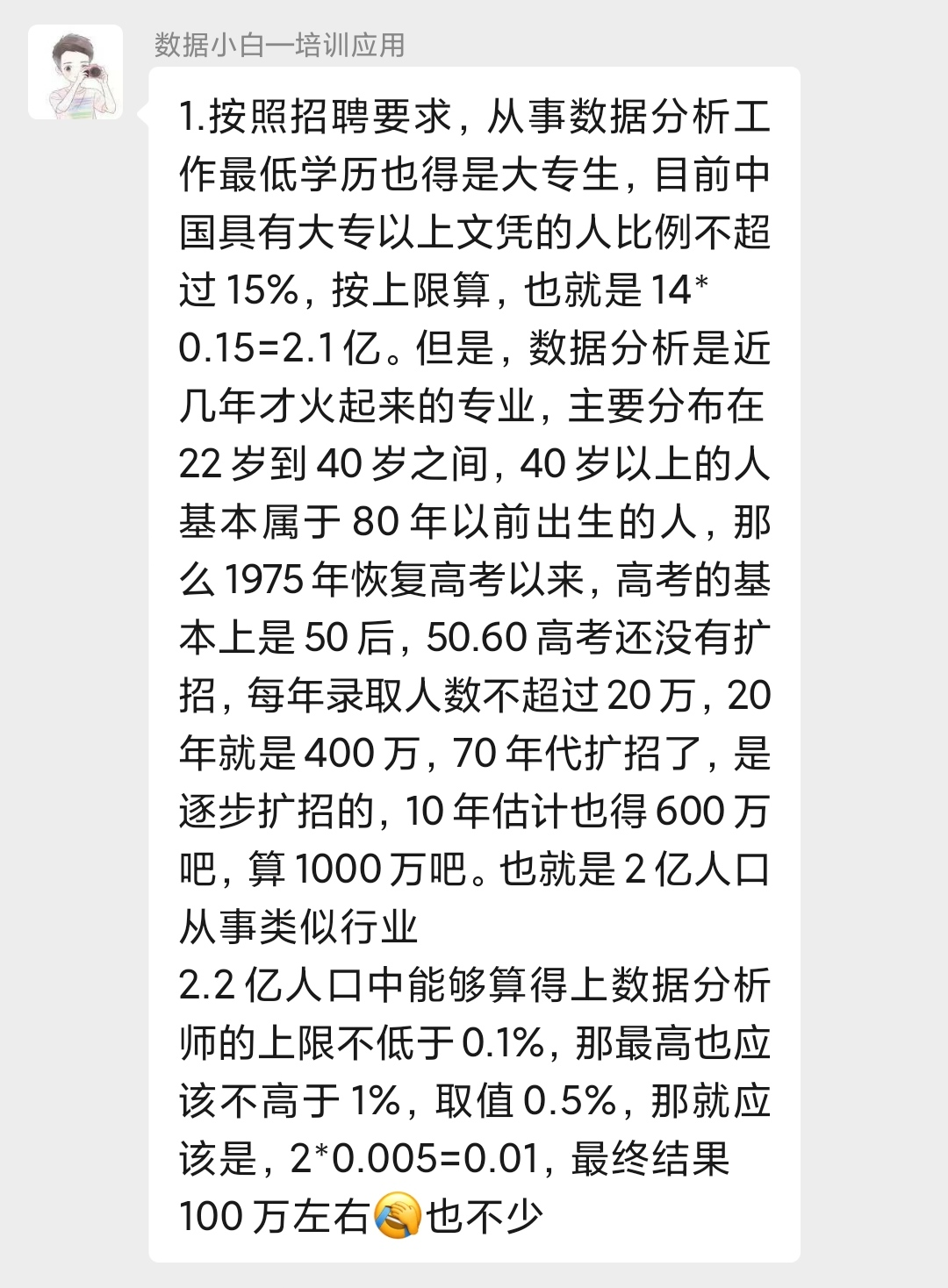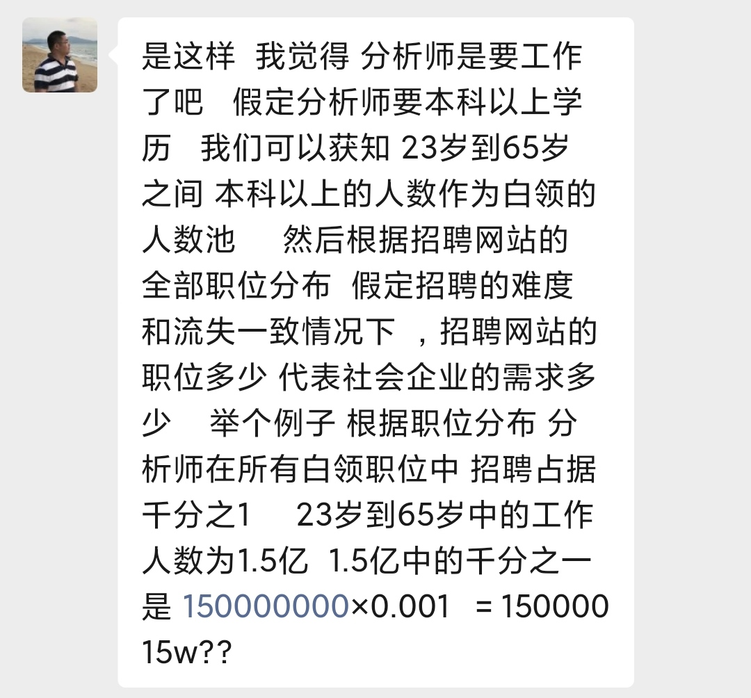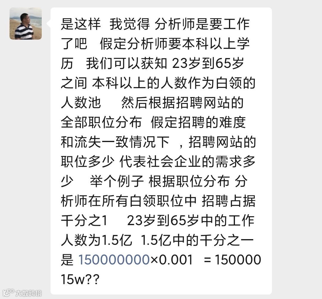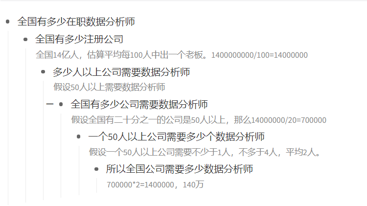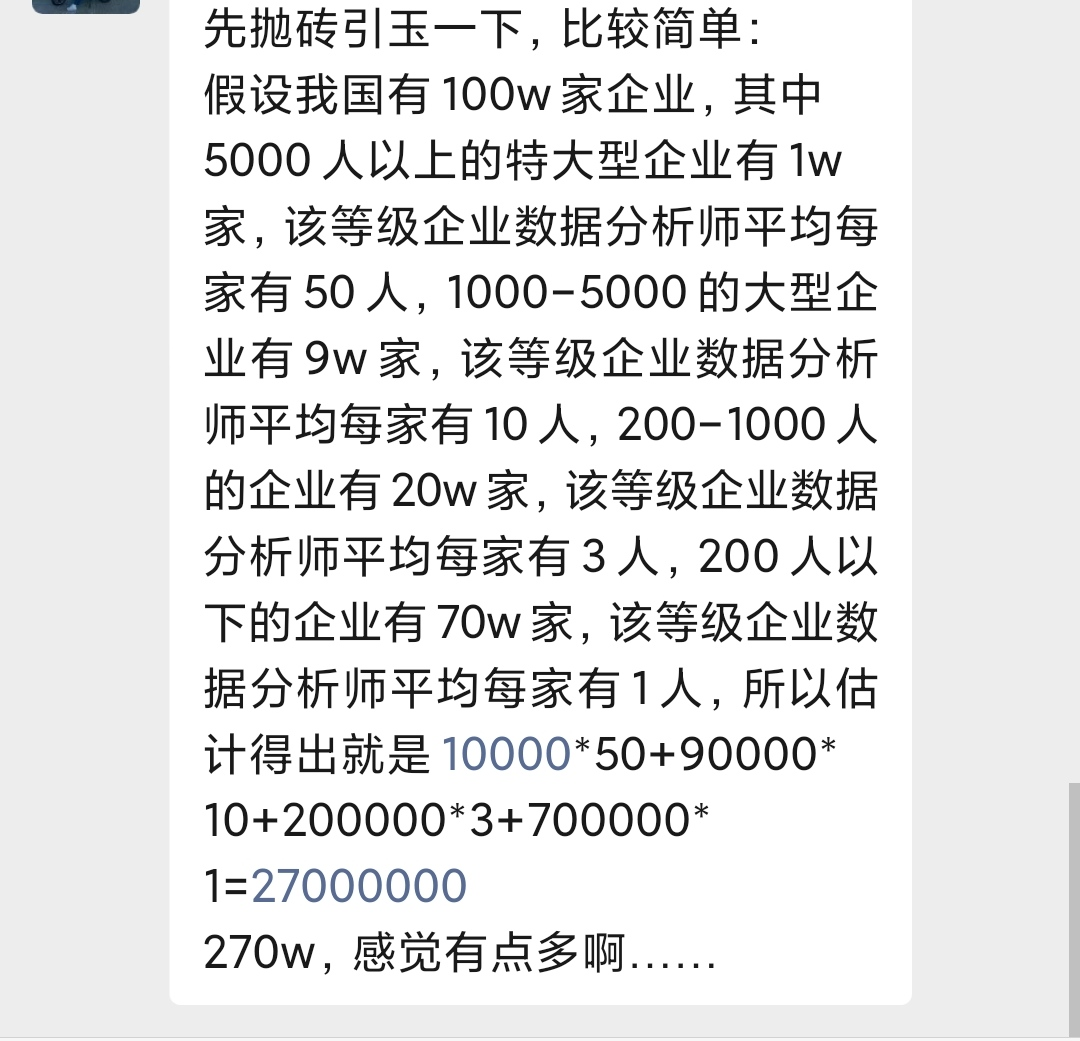 这是咱们群第一次讨论费米问题,可能很多朋友不知道该怎么去拆解、回答,但实际在重逻辑和数据的行业里,比如数据、咨询、产品、运营岗,费米估算都是笔面试的常见题型。这类题目在分解的时候,也是比较有趣的。所以无论如何,大家都要学会这类题目的解题方法哟。