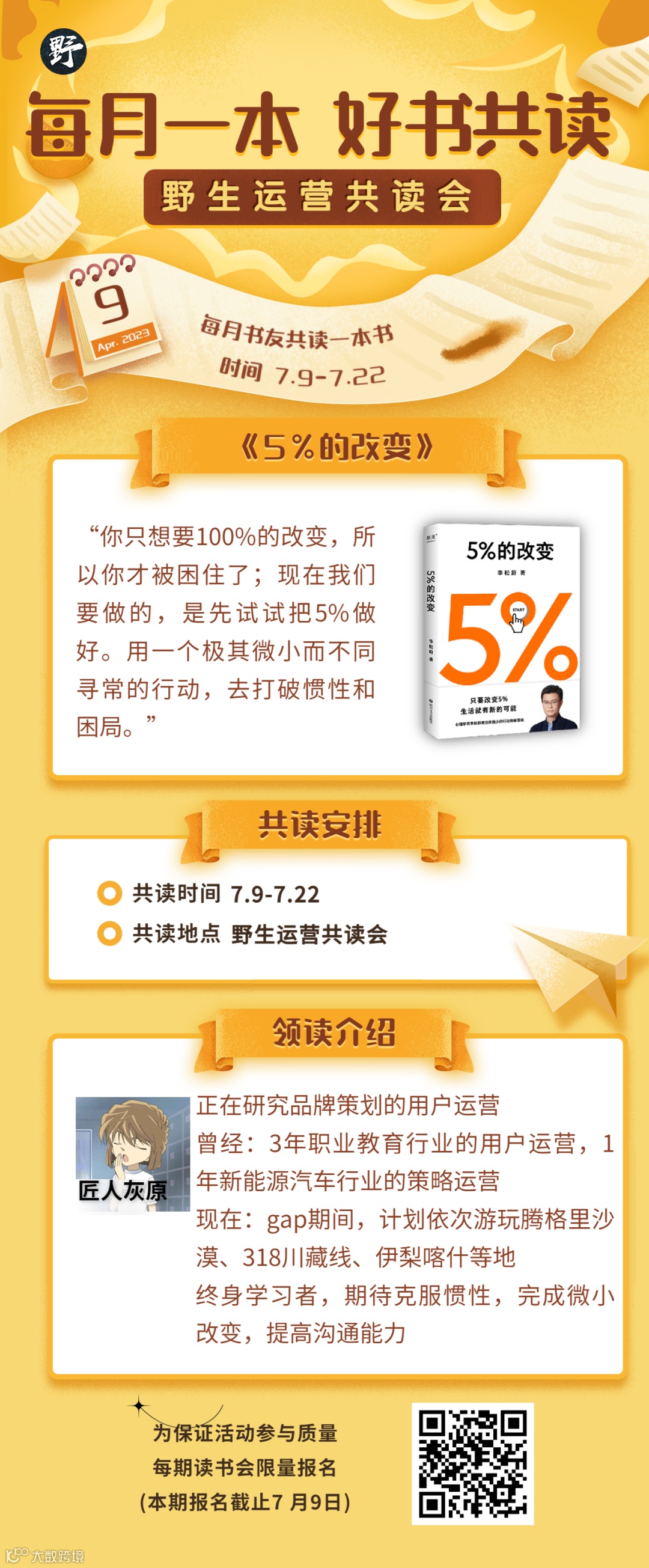 7月9日~22日,我们会共读《5%的改变》这本书。“你只想要100%的改变,所以你才被困住了;现在我们要做的,是先试试把5%做好。用一个极其微小而不同寻常的行动,去打破惯性和困局”