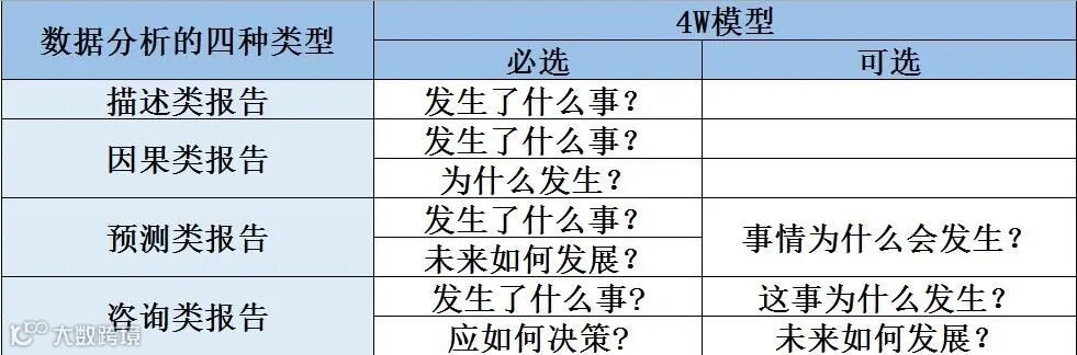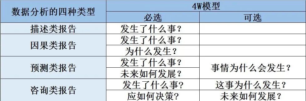 对于数据分析报告,首先要有一个概念性的认识,按照报告陈述的思路,可分为四类: