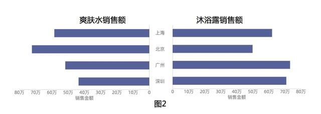 同样的数据,想要表达的主题不同,图表形式就不同,图1表达是爽肤水和沐浴露两个品类在不同城市的销量排名,图2主要表达的是在相同城市在两个不同的品类的销量差异。