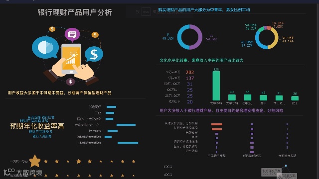 这是我用FineBI制作的银行理财产品用户分析,利用FineBI的联动钻取和螺旋式分析功能,通过图表联动钻取,给领导详细拆解汇报不同性别,年龄段的用户特征,各类特征分析数据一目了然,比起一页页的翻ppt,这样的汇报方式更加直观、简洁,领导更加喜欢。