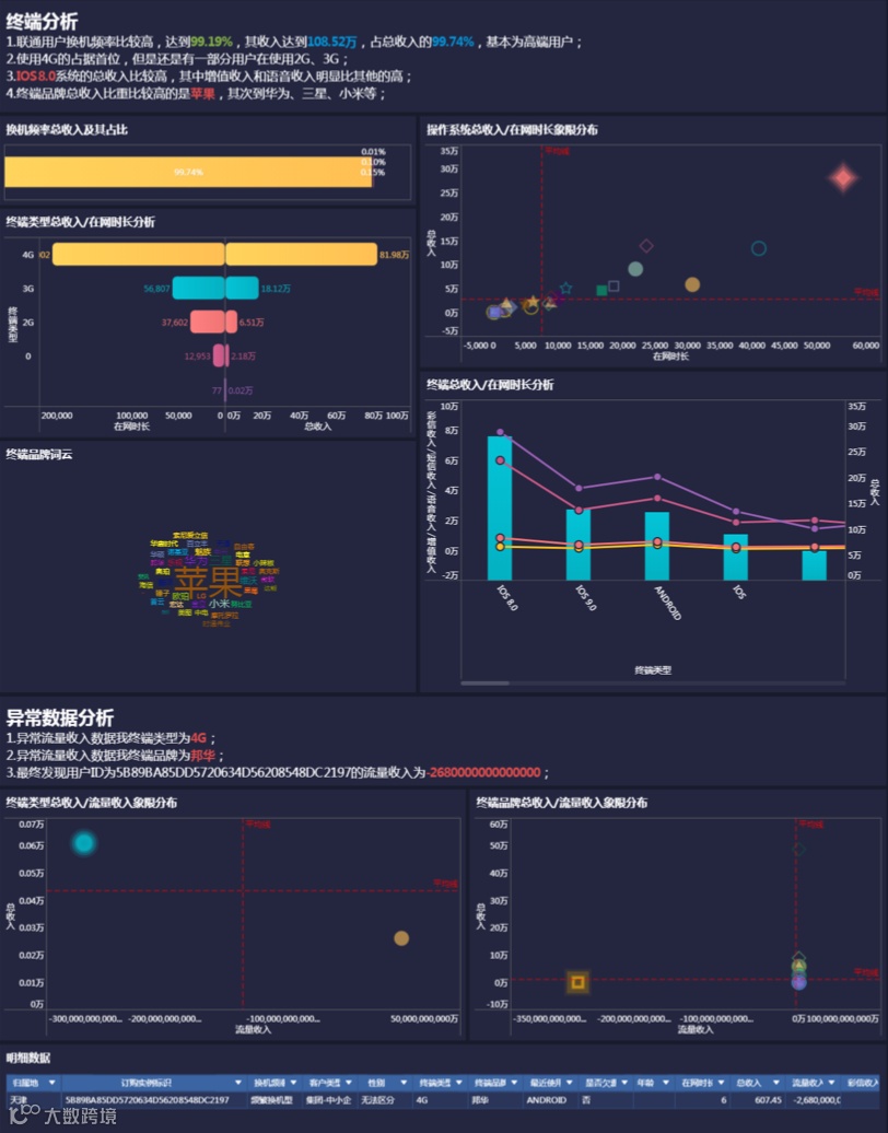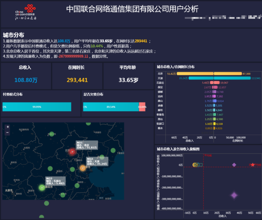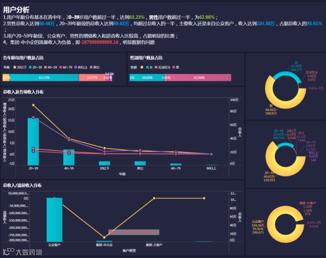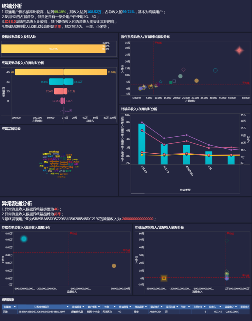 但是一页ppt只能呈现有限个图表和结论,且图表多以静态形式呈现,难以直观表达两个分析图表之间的联系,所以在形式上,我们可以选择更加新颖的可视化分析报告形式来展现分析结论,比如下面这样的: