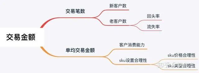比方说成交金额一般都是用来判断经营状况的因素之一(先不考虑成本),我们通过分析发现该门店的成交金额和其他门店差距很大,交易金额=支付笔数*单均支付金额,我们再进一步分析交易笔数和单均交易金额,交易笔数又与新老客户的分布有很大关系, 门店新客增长怎么样,老客回头率怎么样......