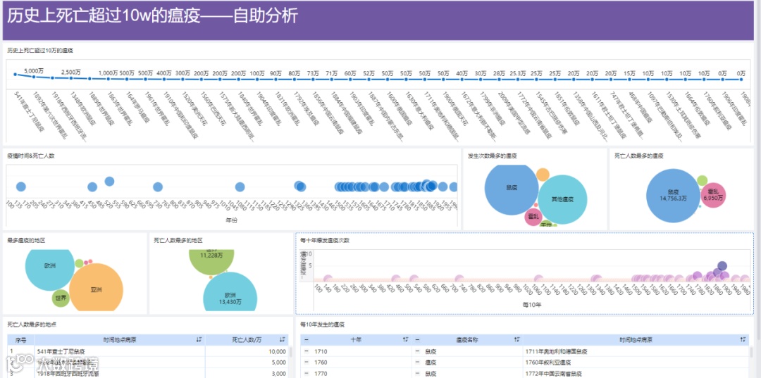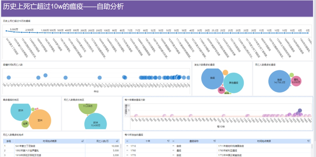 说做就做,于是我从网上随便找到了一份历史上瘟疫的名单,用python稍微加工了一下,将结果导入到FineBI,稍作处理就得到了自助数据集。(原始数据见文末)