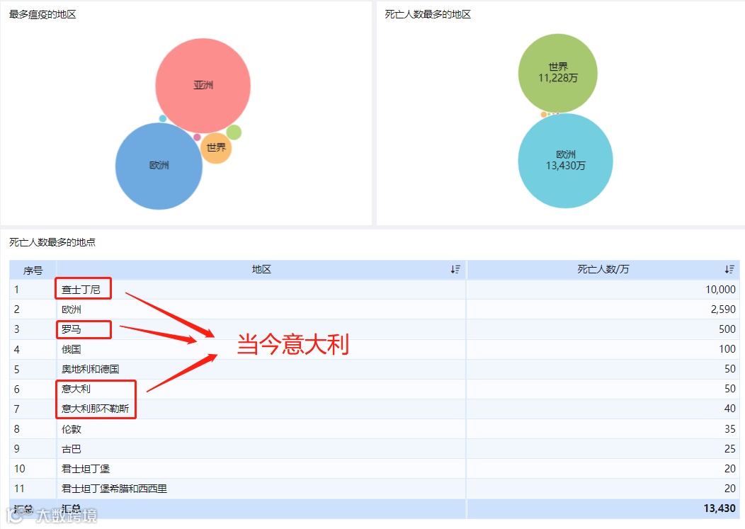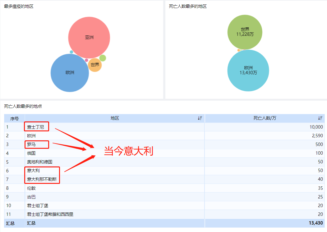 我继续拉出瘟疫和地区之间的关联,查看当前被记录最多的欧洲疫情,这一关联还真发现了问题——