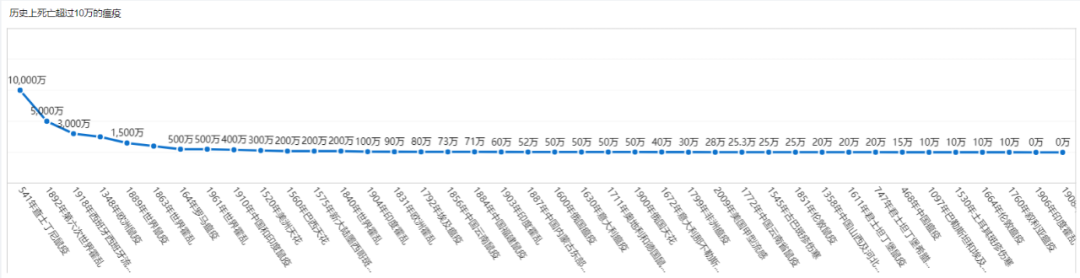随着医疗水平的进步,我猜测人类对瘟疫的掌控力应当是逐渐增加的,于是拉出了所有年份死亡人数。