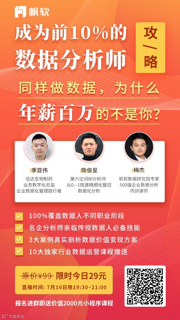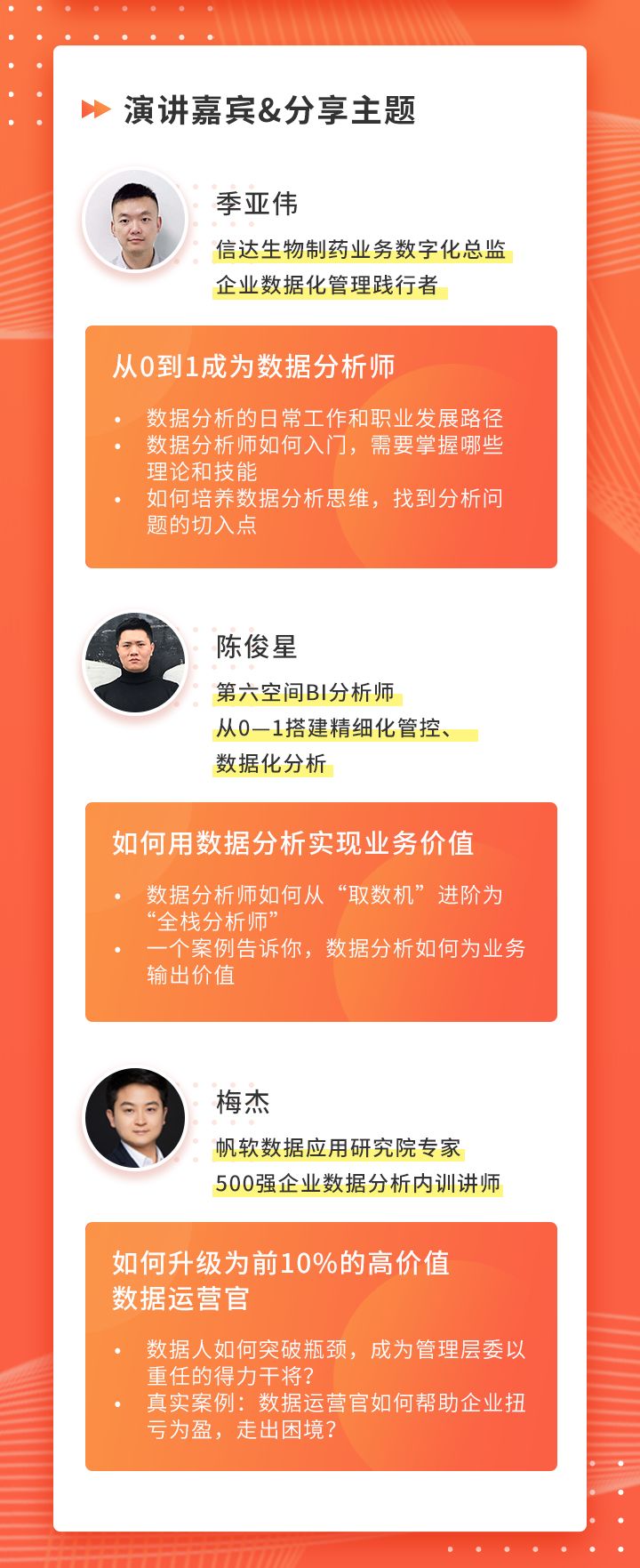 任何脱离实际的理论都是扯淡,现身说法才有意义。这次直播我觉得比较好的一点是,邀请的嘉宾都是在企业有过多年实战经验的数据分析师。分享的内容很实在,都是数据分析这条路上的坑点以及方向性的建议,所以大家不妨报名听一听。