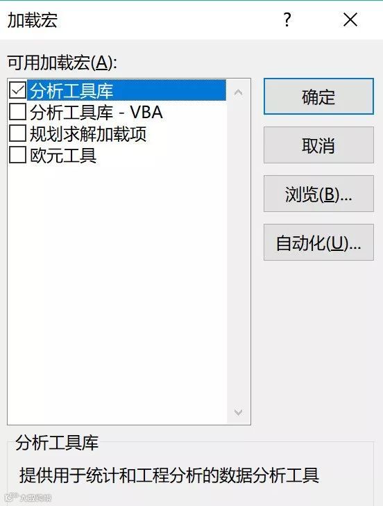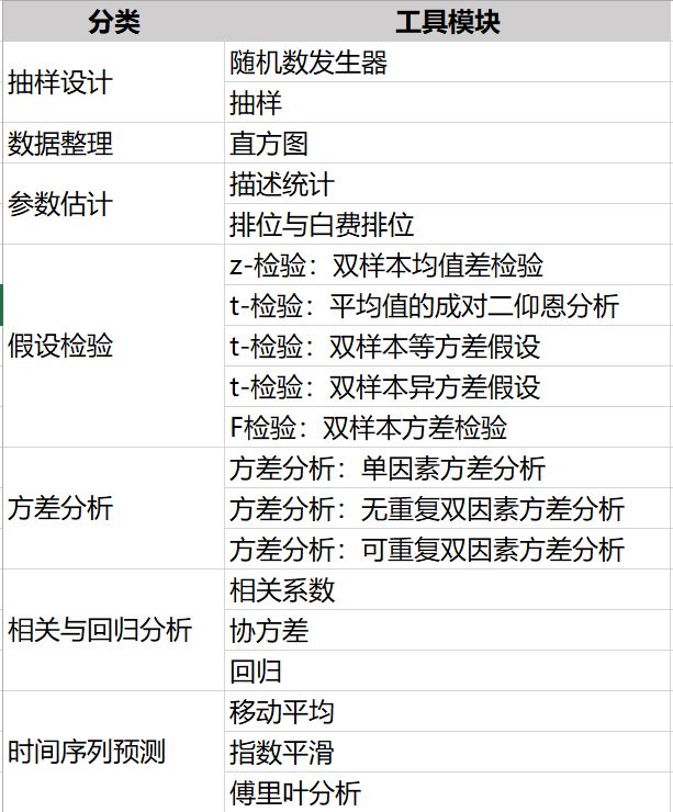 专业的统计分析工具有SPSS,R或Python,但对于大部分新手一天两天比较难上手。永远不要忘记万能的Excel,Excel 2016 里自带以了一个统计分析工具——“分析工具库”。实际上就是一个外部宏(程序)模块,专门为用户提供一些高级统计函数和实用的数据分析工具。