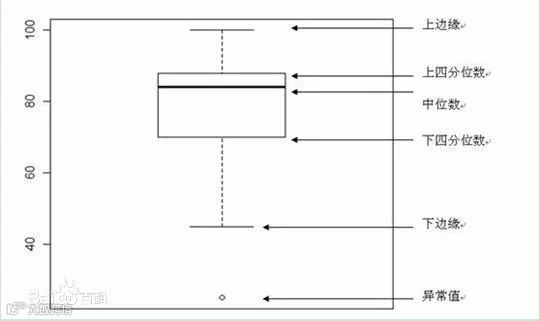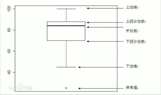 对于数据的离散情况,还有一个更直观的方法,就是箱线图。箱线图利用6个指标描述数据的离散情况。这6个指标分别是最小值,第一四分位数、中位数、第三四分位数与最大值和异常值。