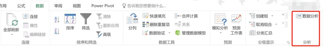 以上一波操作后,“数据”选项卡中会显示出添加的“数据分析”功能。