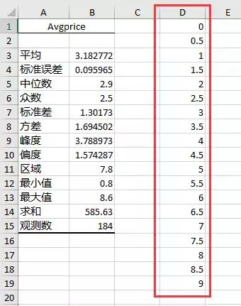 根据描述统计的结果,在空白列构造间隔为0.5的等差数列作为接收区域D1:D19,最大值为9,最小值为0。