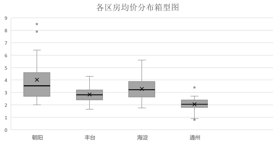 现在来了解北京各区的房价分析,把他加工成箱型图,这也是最常用的描述统计图表。