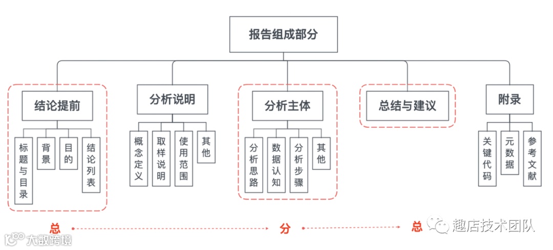 数据分析报告要有一个清晰的架构,层次分明能降低阅读成本,有助于信息的传达。虽然不同类型的分析报告有其适用的呈现方式,但总的来说作为议论文的一种,大部分的分析报告还是适用总-分-(总) 的结构。